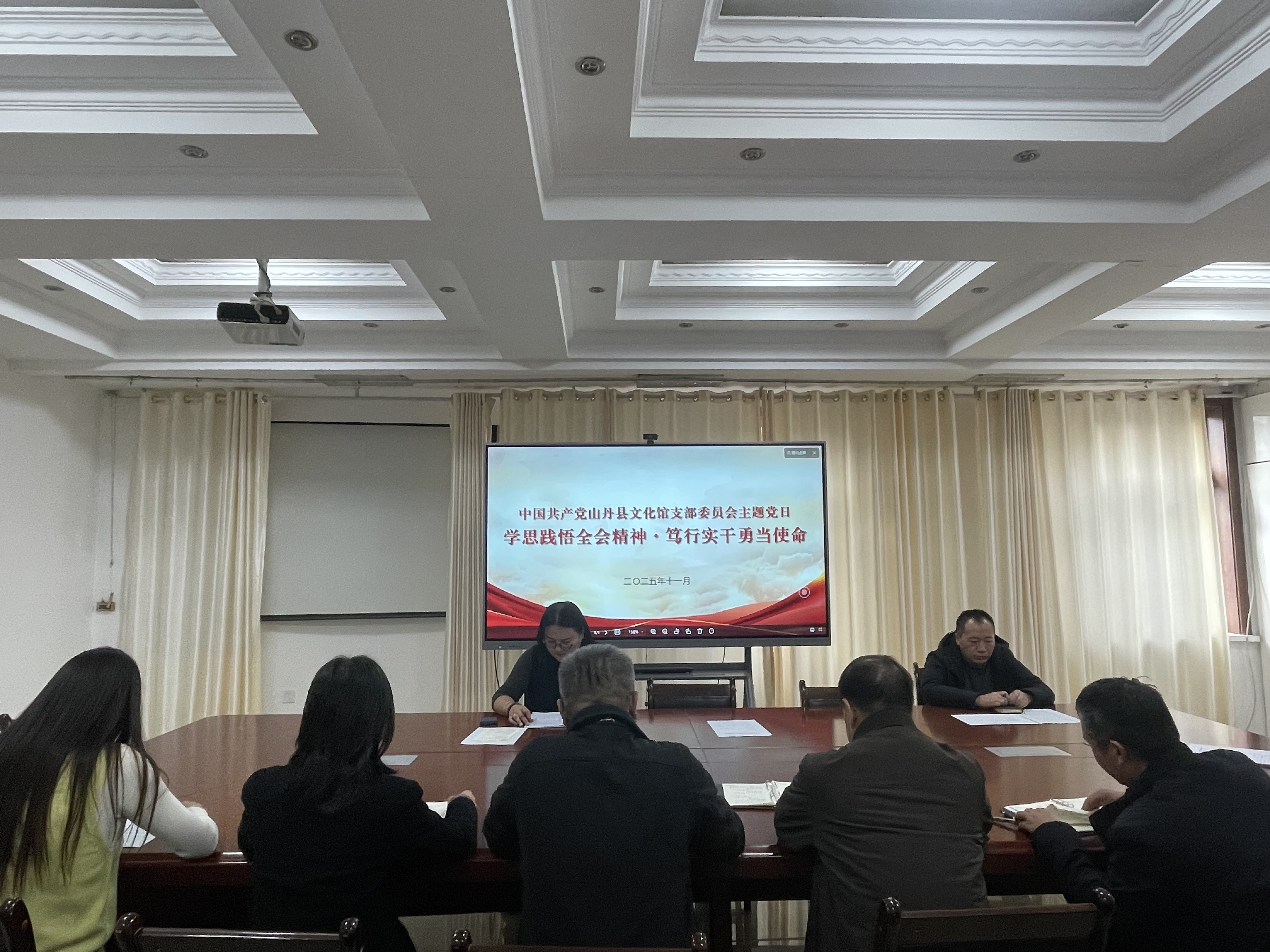 党建引领强根基,凝聚发展新合力。馆党支部始终坚持把政治建设摆在首位,以高质量党建引领文化事业高质量发展。深化理论武装铸魂,严格落实“第一议题”“每会必学”制度,依托例会、“三会一课”等载体常态化开展学习教育,全年组织主题党日12次、党员大会4次、书记讲党课4次,引导干部职工深刻领悟“两个确立”的决定性意义,增强“四个意识”、坚定“四个自信”、做到“两个维护”。压实廉政责任守底线,健全党风廉政责任制,严格执行“三重一大”集体决策制度,常态化开展廉政教育,组织参观廉政教育基地、观看警示片等活动,全年开展廉政提醒和谈心谈话10余次,签订相关承诺书,实现廉政教育全覆盖。坚守意识形态阵地,成立工作领导小组,实行“支部书记负总责、支委各负其责”机制,严格执行信息发布“三审”制度,全年审核发布文化信息、视频234条,筑牢意识形态、文化安全防线。深化党建赋能惠民,组织在职党员9人次参与社区“共驻共建”,聚焦帮扶村老军乡孙庄村文旅发展,开展入户帮扶20余人次,捐赠慰问品折合4000元,将党建优势转化为服务群众的实际成效。